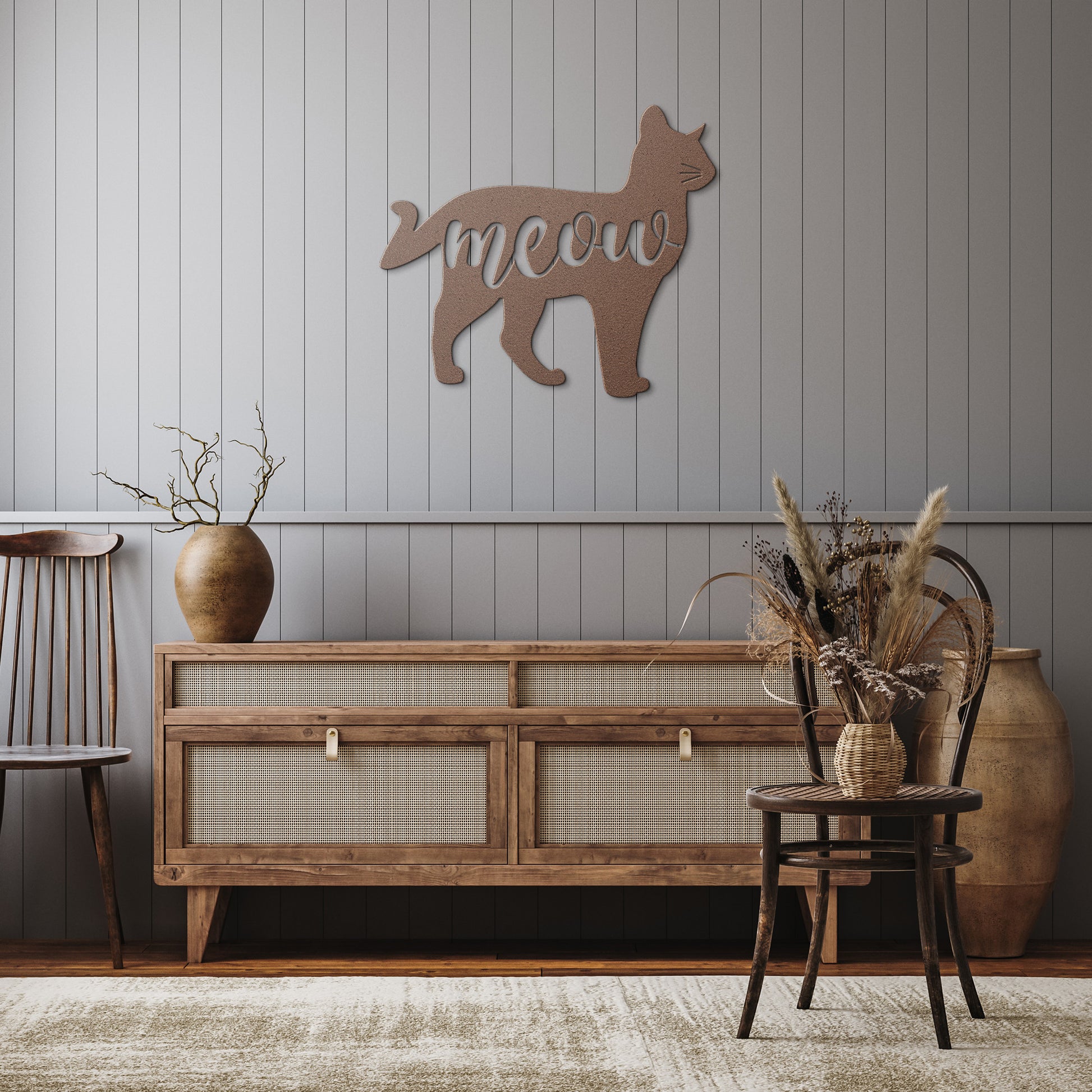MEEEYOW!! Elevate your home decor with our beautiful metal feline. Made with 18 gauge steel and powder coated in your choice of 5 colors, this sign is built to withstand the elements for years of enjoyment. Add a touch of elegance to your home on the inside, outside, or both!