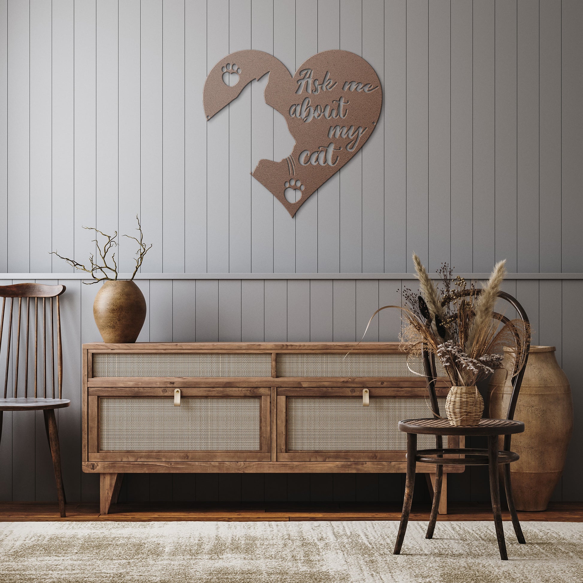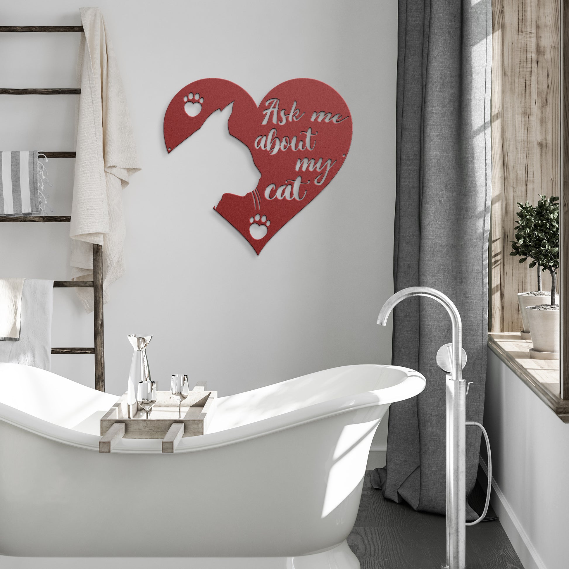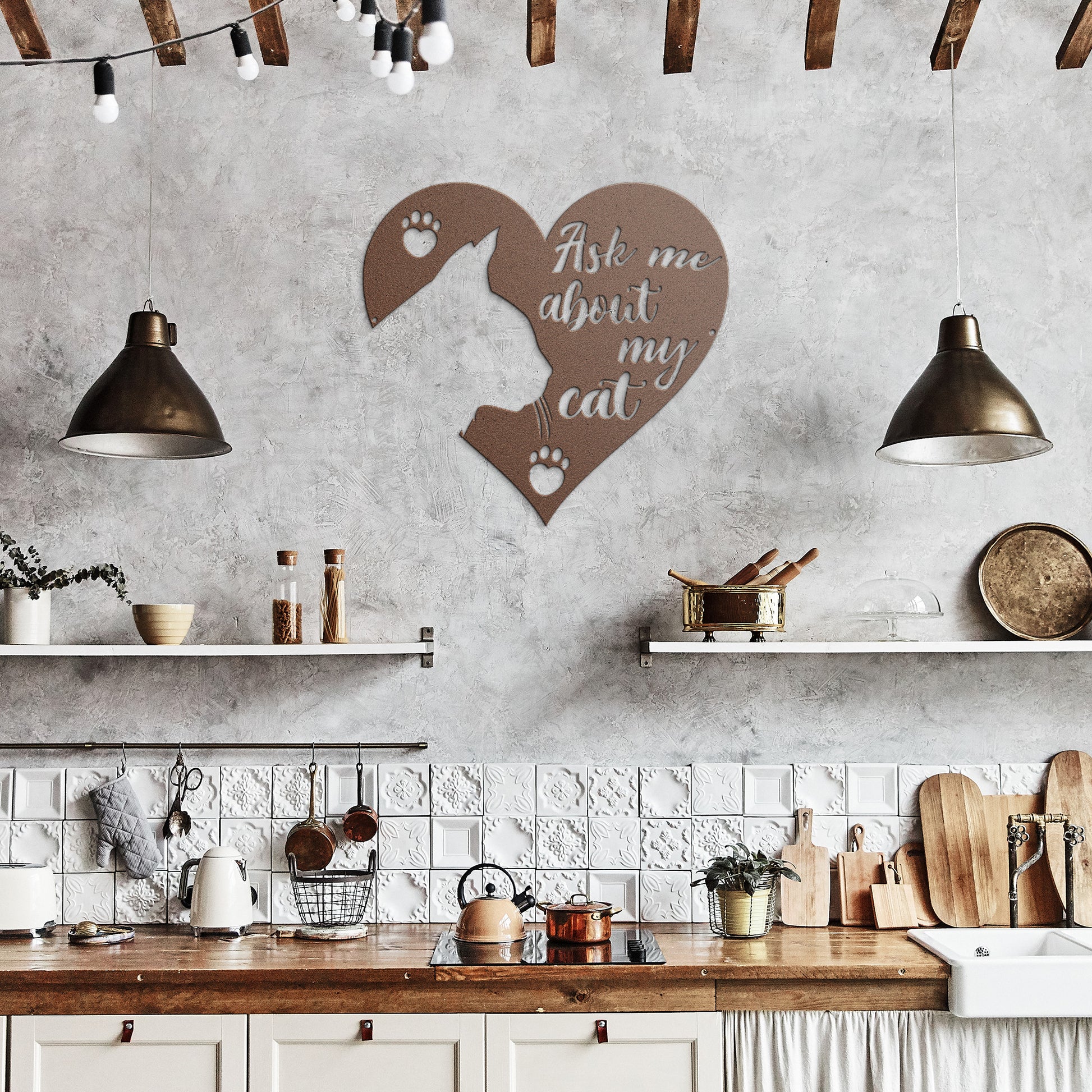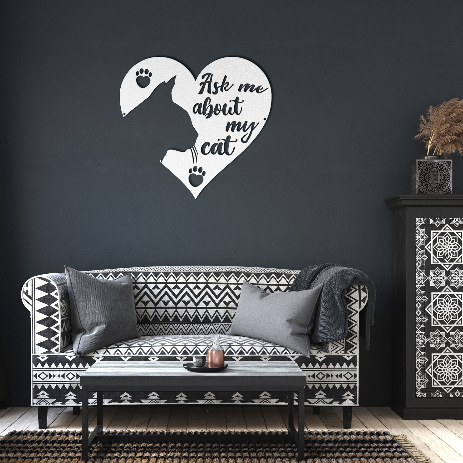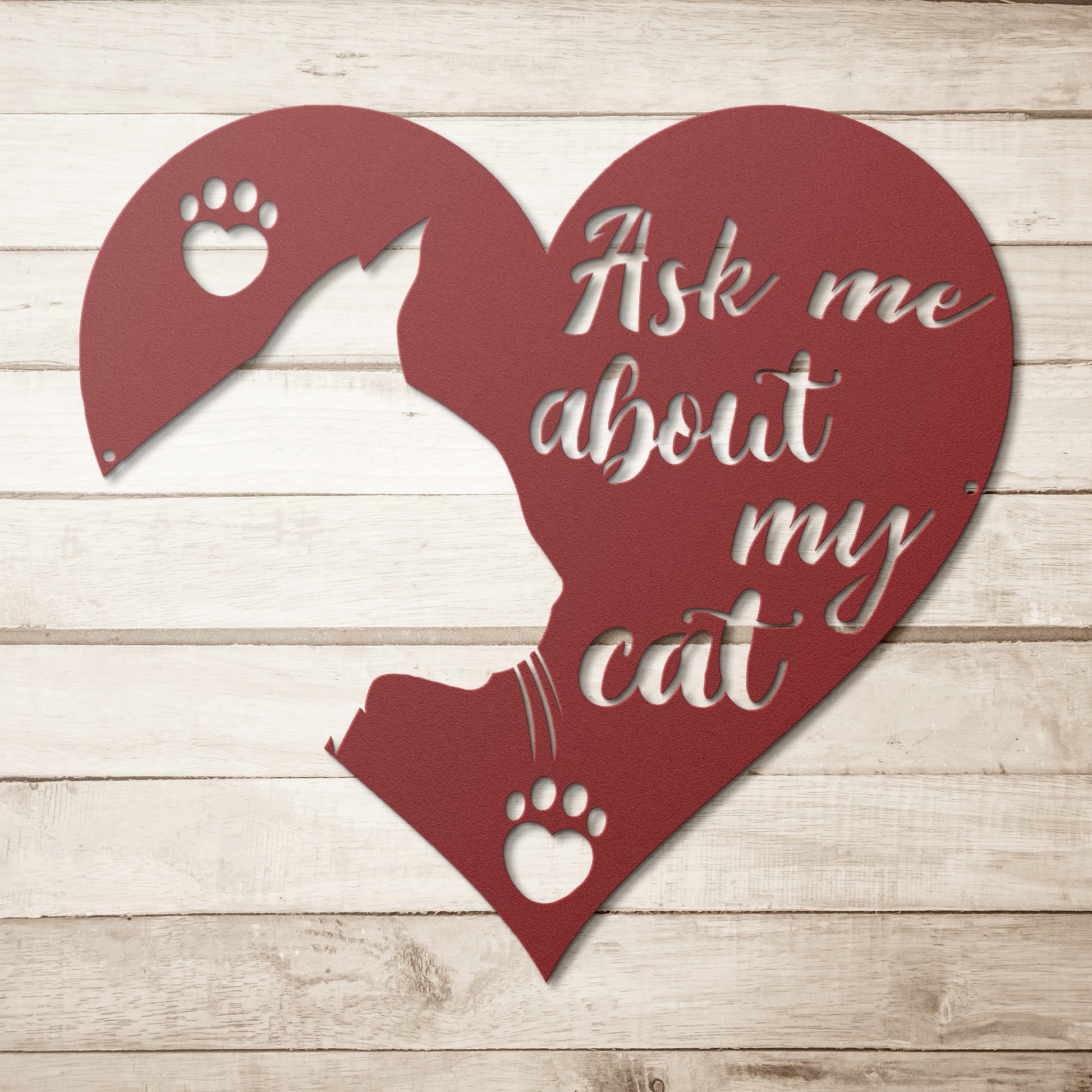 Elevate your home decor with our Ask Me About my Cat metal sign. Made with 18 gauge steel and powder coated in your choice of 5 colors, this sign is built to withstand the elements for years of enjoyment. Add a touch of elegance to your home on the inside, outside, or both!