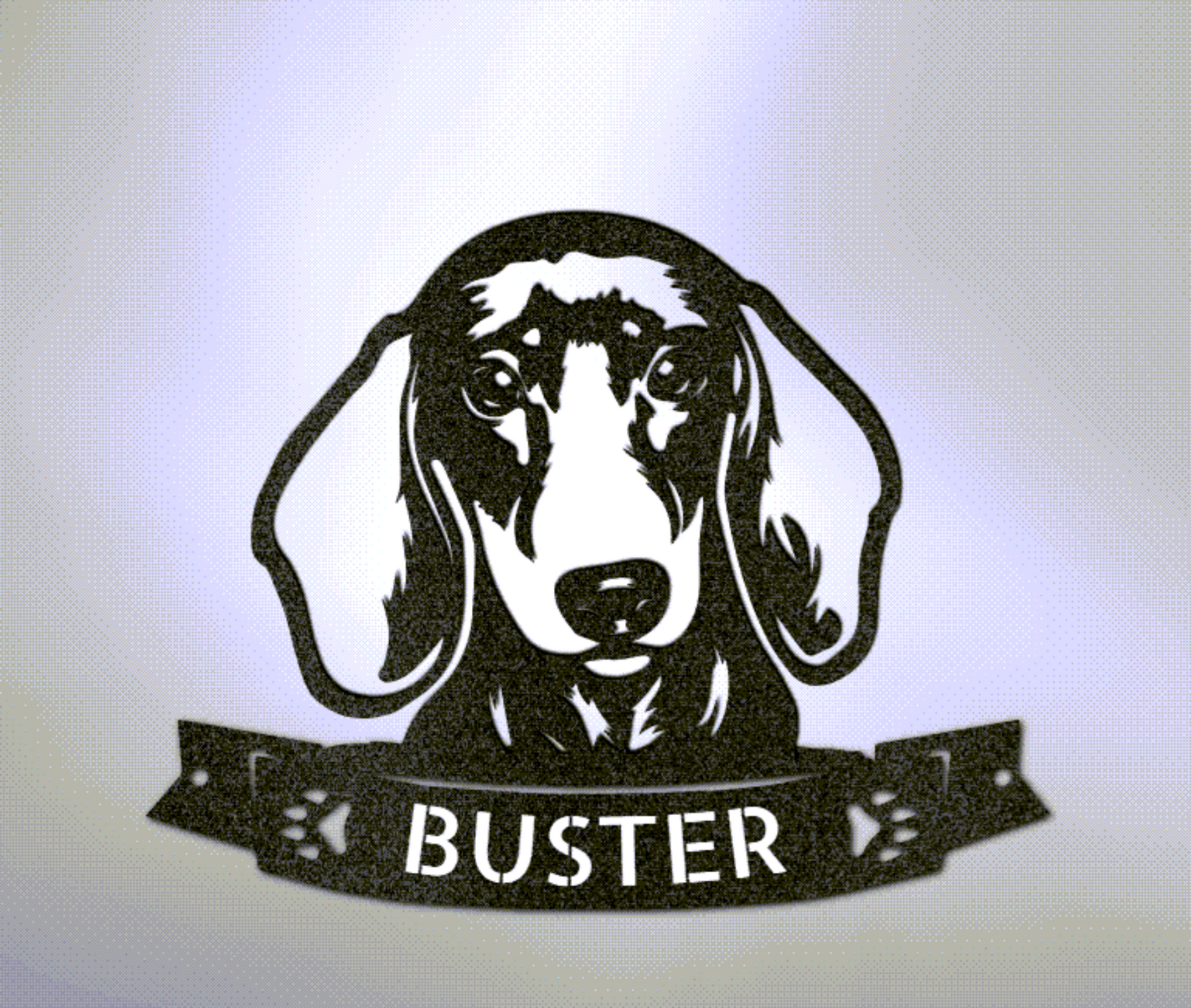 Dachshund lovers everywhere can proudly display their love for their doggy with this custom metal wall sign showing a cute puppy face with a monogram banner.
