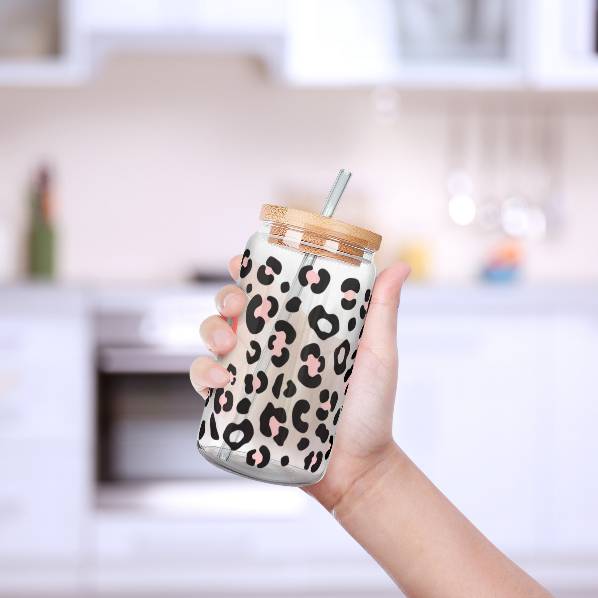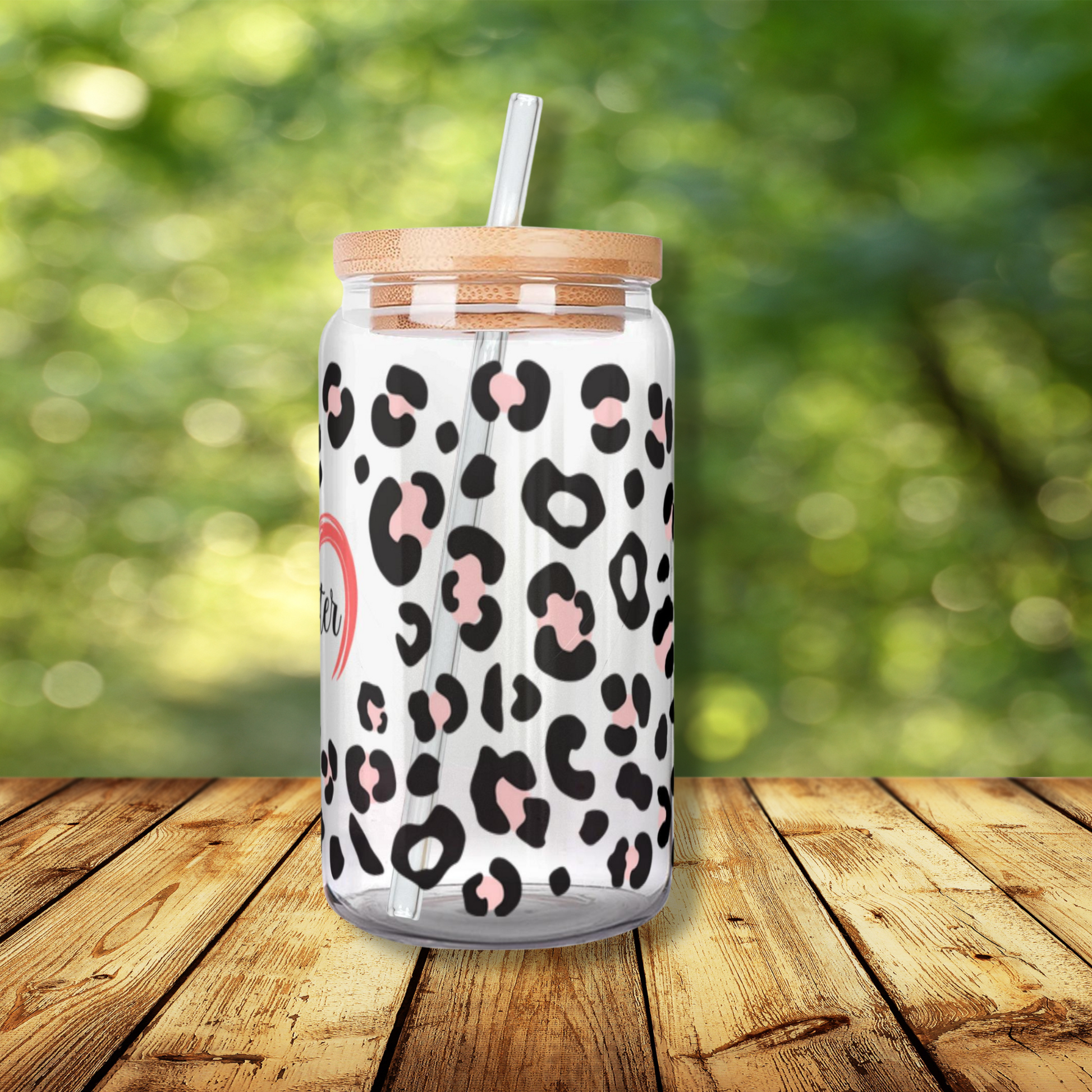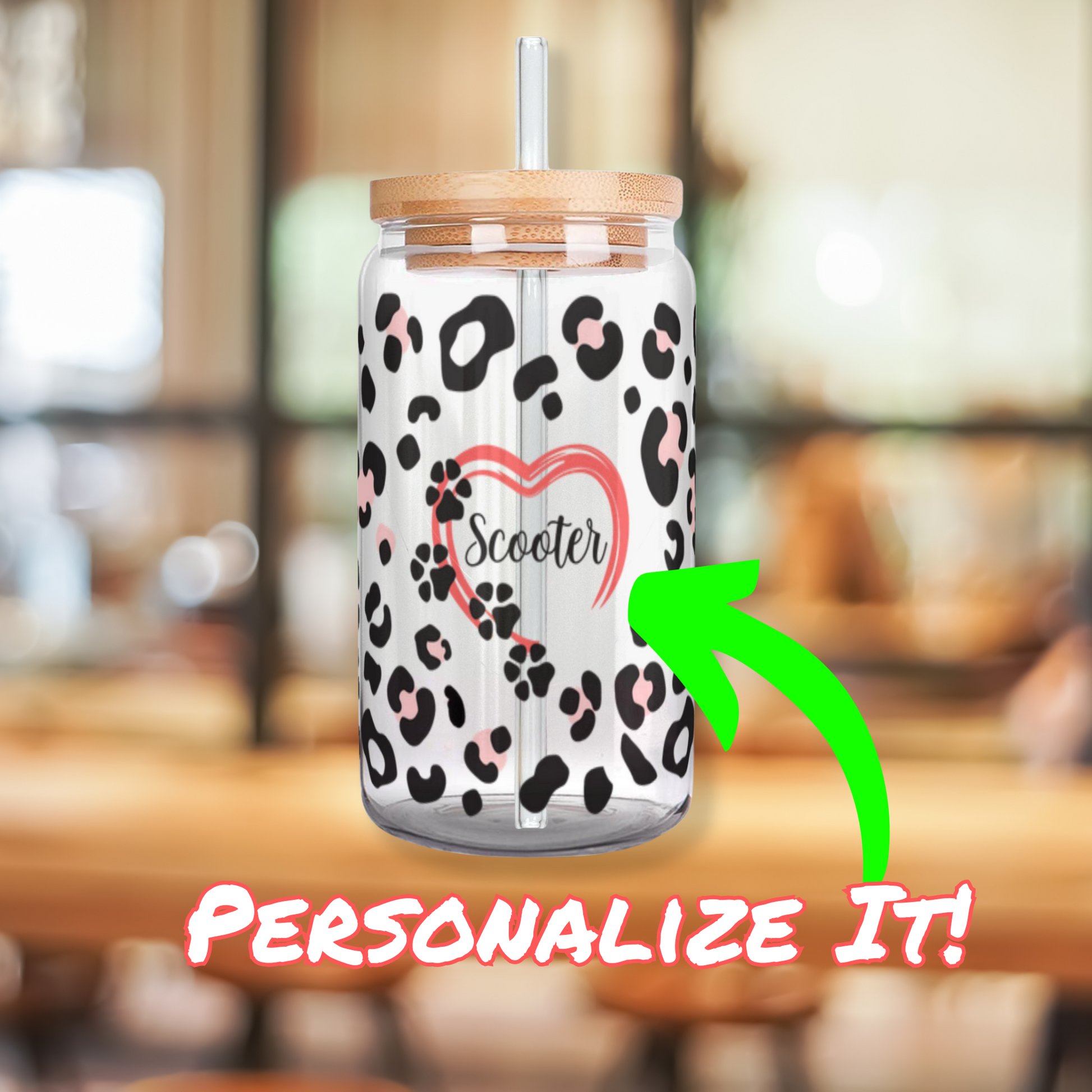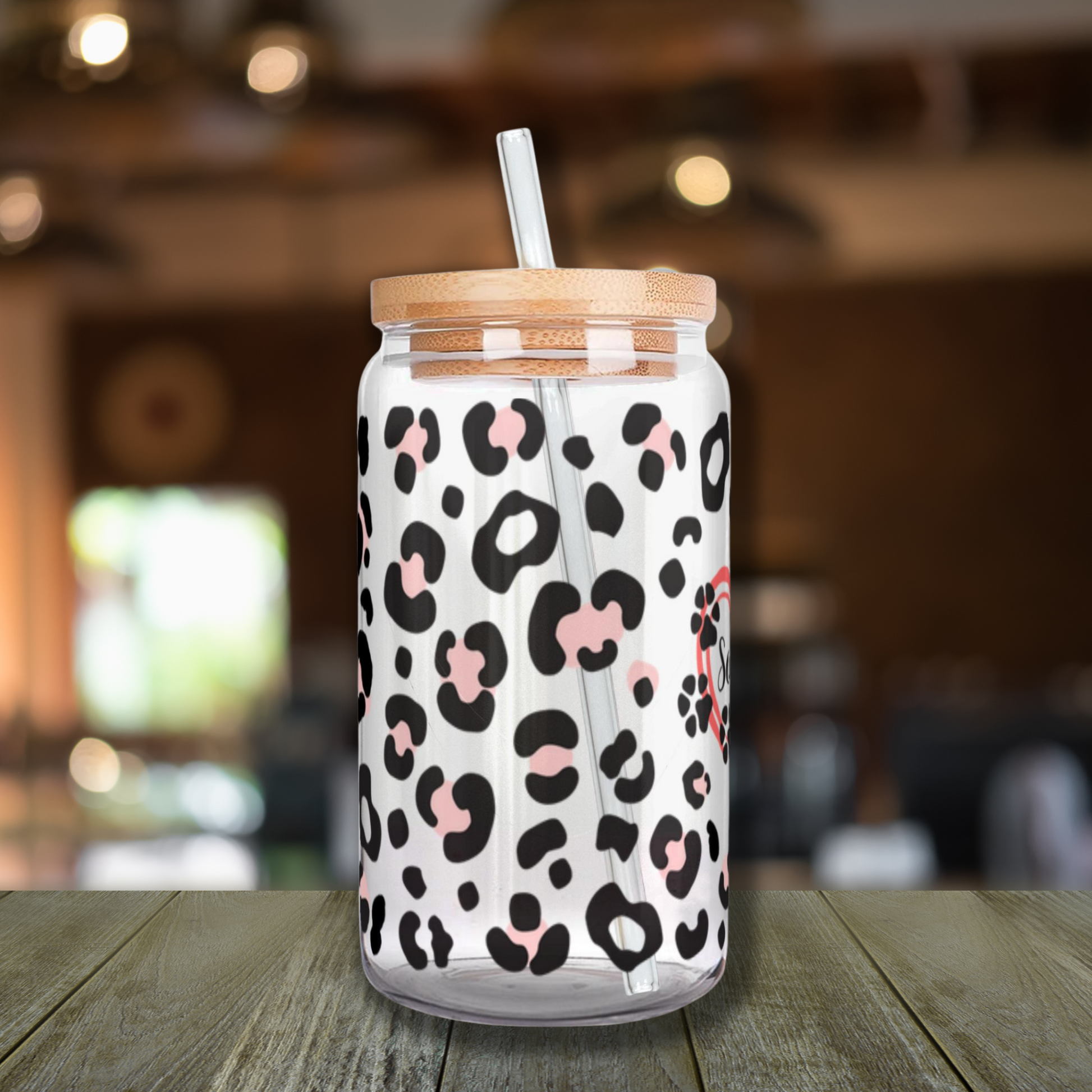 Iced Coffee or Tea Glass with Wooden Lid and Straw Leopard Print Personalized with Your Pet’s Name