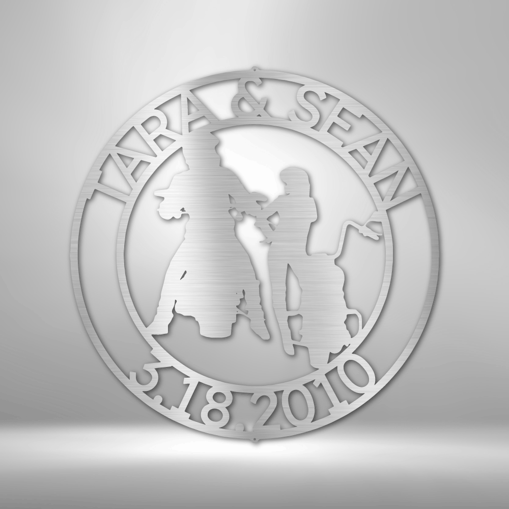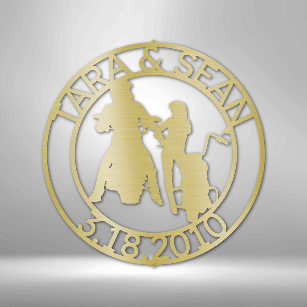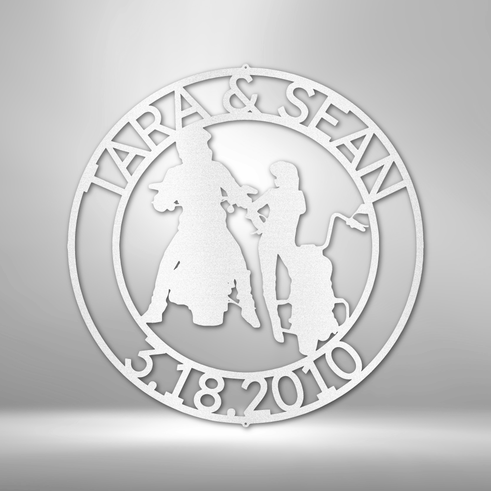 Motorcycle Guy and Gal Round Steel Sign Custom Names and Date