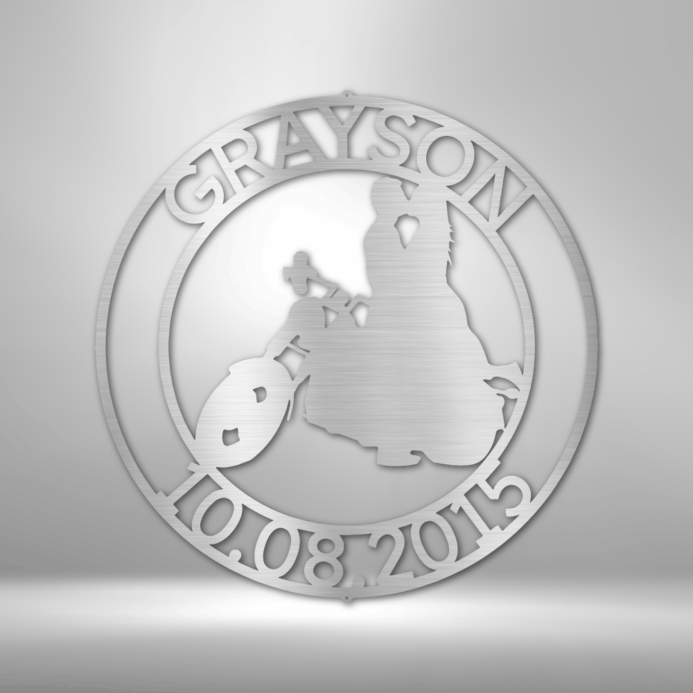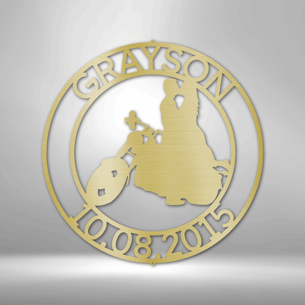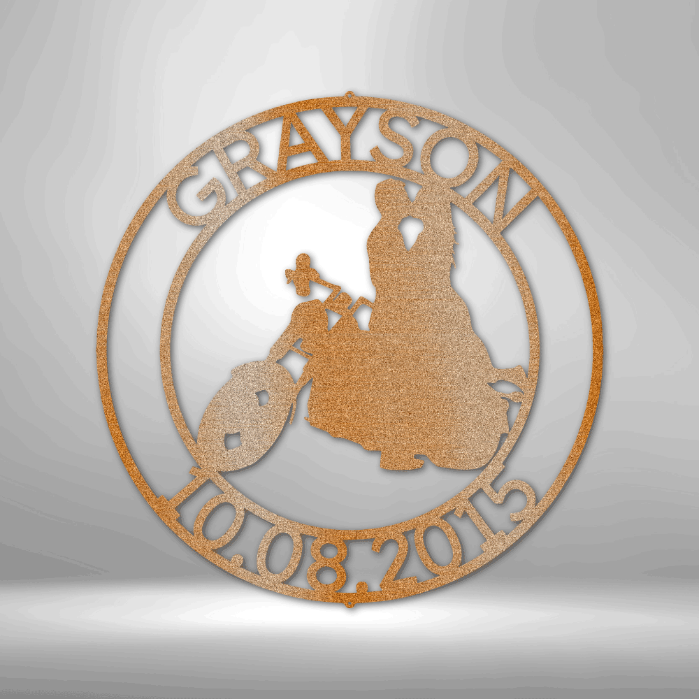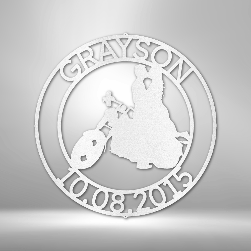 Motorcycle Couple Embrace Round Steel Sign with Couple Name and Date